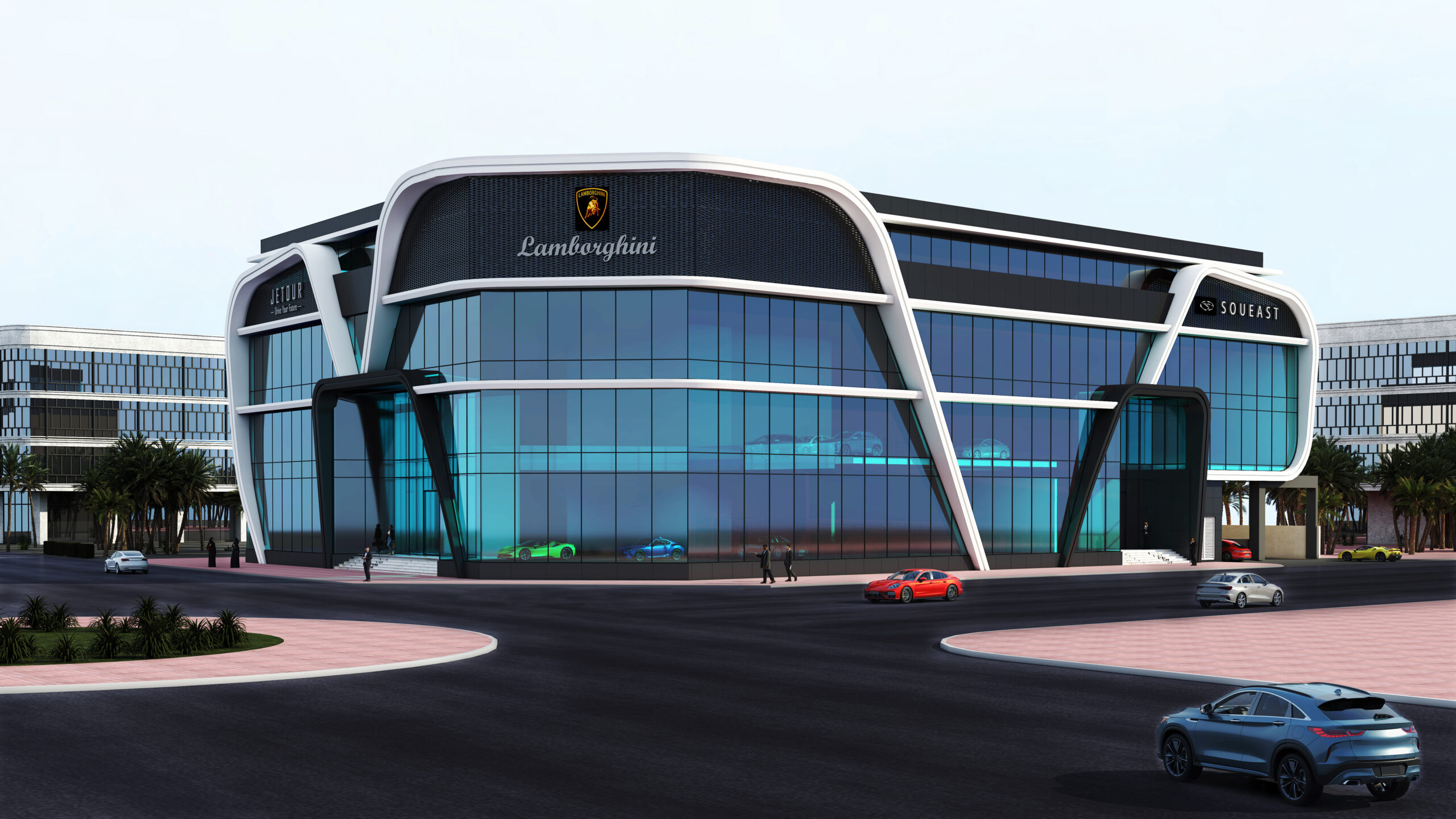 Lamborghini, JETOUR & SOUEAST_Showroom & Office Building, B+G+M+1+Roof Floor on Plot No-3640570 @ Sheik Zayed Road, Dubai for M/S Elite Cars International. (Total Built-up Area -136,250.00 sqft).